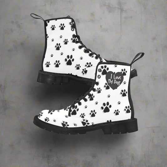 I Love My Dog - Women's Lace Up White Boots With Paw Prints - Available in 2 Colors