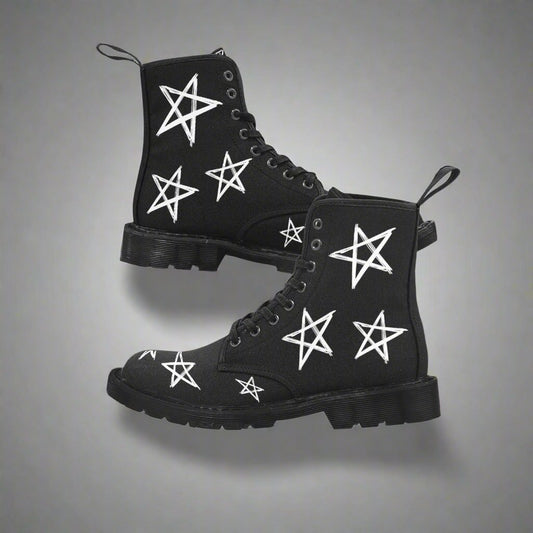Stars - Women's Lace Up Black Boots With White Stars