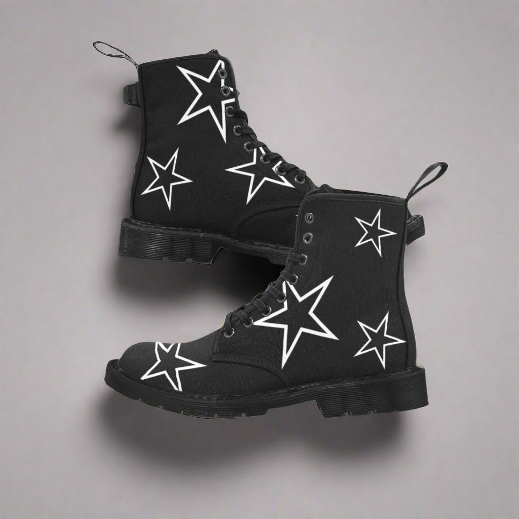 Just Star Me - Women's Lace Up Black Boots With White Outlined Stars